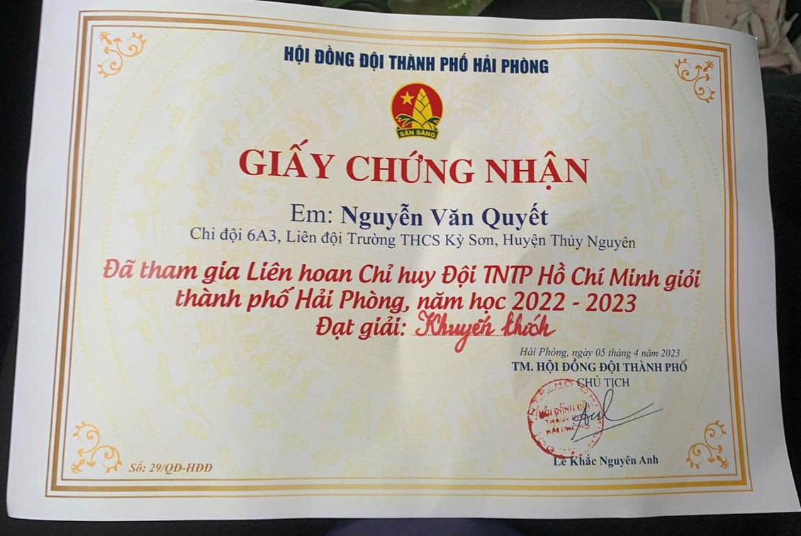 Liên hoan Chỉ huy Đội diễn ra trong một ngày chủ nhật 9/4/2023. Liên đội trường THCS Kỳ Sơn có em Nguyễn Văn Quyết - Chi đội lớp 6A3 tham gia liên hoan và đạt giải khuyến khích.