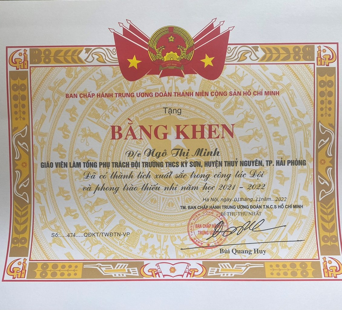 ☘️Cô giáo Tổng phụ trách: Ngô Thị Minh - giáo viên TPT Đội trường THCS Kỳ Sơn đã được nhận Bằng khen của Ban Chấp hành Trung ương Đoàn TNCS Hồ Chí Minh - Đã có thành tích xuất sắc trong công tác Đội và phong trào thiếu nhi năm học 2021 - 2022.
