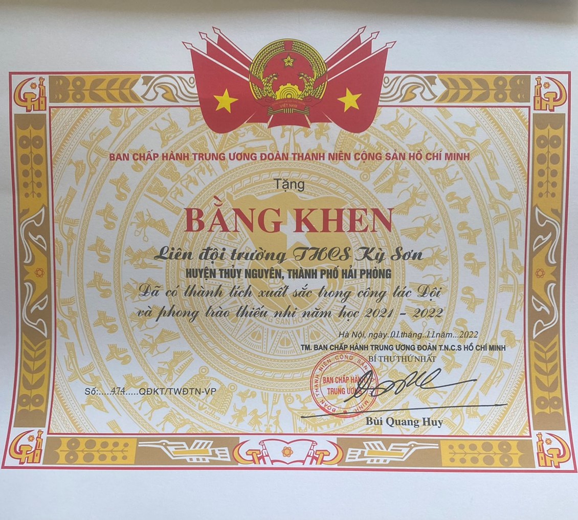 ☘️Liên đội trường THCS Kỳ Sơn nhận bằng khen của Ban Chấp hành Trung ương Đoàn TNCS Hồ Chí Minh - Đã có thành tích xuất sắc trong công tác Đội và phong trào thiếu nhi năm học 2021 - 2022.