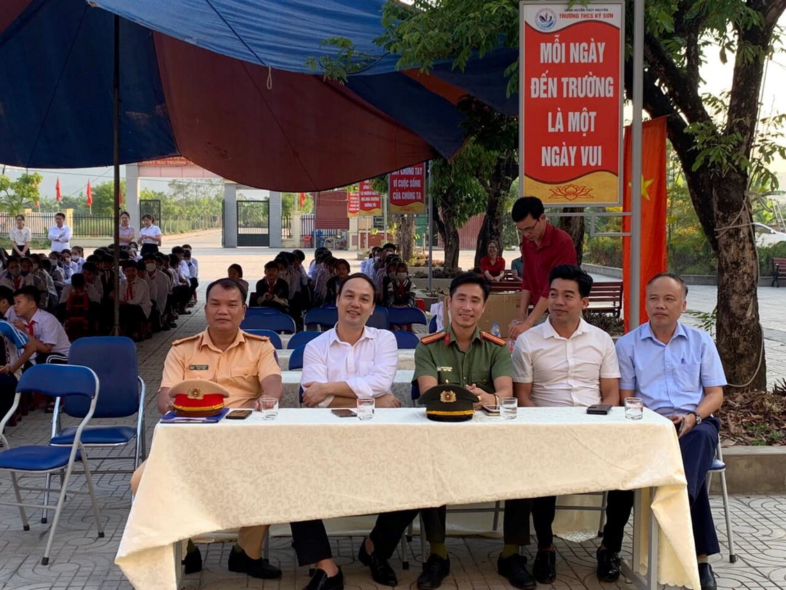 Tại buổi học tập chuyên đề đón tiếp Thiếu tá Nguyễn Thành Đoàn - Chủ tịch công đoàn Công an huyện Thuỷ Nguyên. Đồng chí Trung tá Hoàng Bá Mạnh - Phó Đội trưởng đội giao thông công an huyện Thuỷ Nguyên. Anh Bùi Đức Thịnh - Bí thư Đoàn xã Kỳ Sơn. Thầy Nguyễn Trung Tĩnh - BTCB - Hiệu trưởng nhà trường cùng các thầy cô giáo trong hội đồng sư phạm nhà trường và 585 bạn học sinh. Qua chuyên đề các bạn học tập rất sôi nổi về các nội dung: Tuyên truyền phổ biến pháp luật về ATGT, phòng chống bạo lực học đường và Ma tuý.